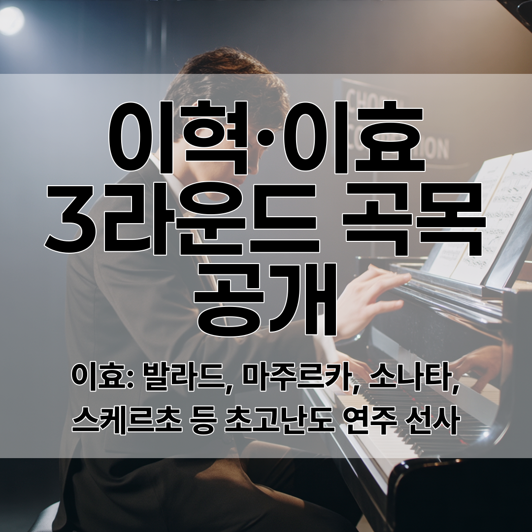 연주 영상은 콩쿠르 공식 유튜브, 홈페이지 등에서 실시간 및 VOD로 공개되어 음악 팬들의 뜨거운 관심을 받았어요. 한편, 이혁의 3라운드 레퍼토리도 조만간 공식 공개될 예정입니다.