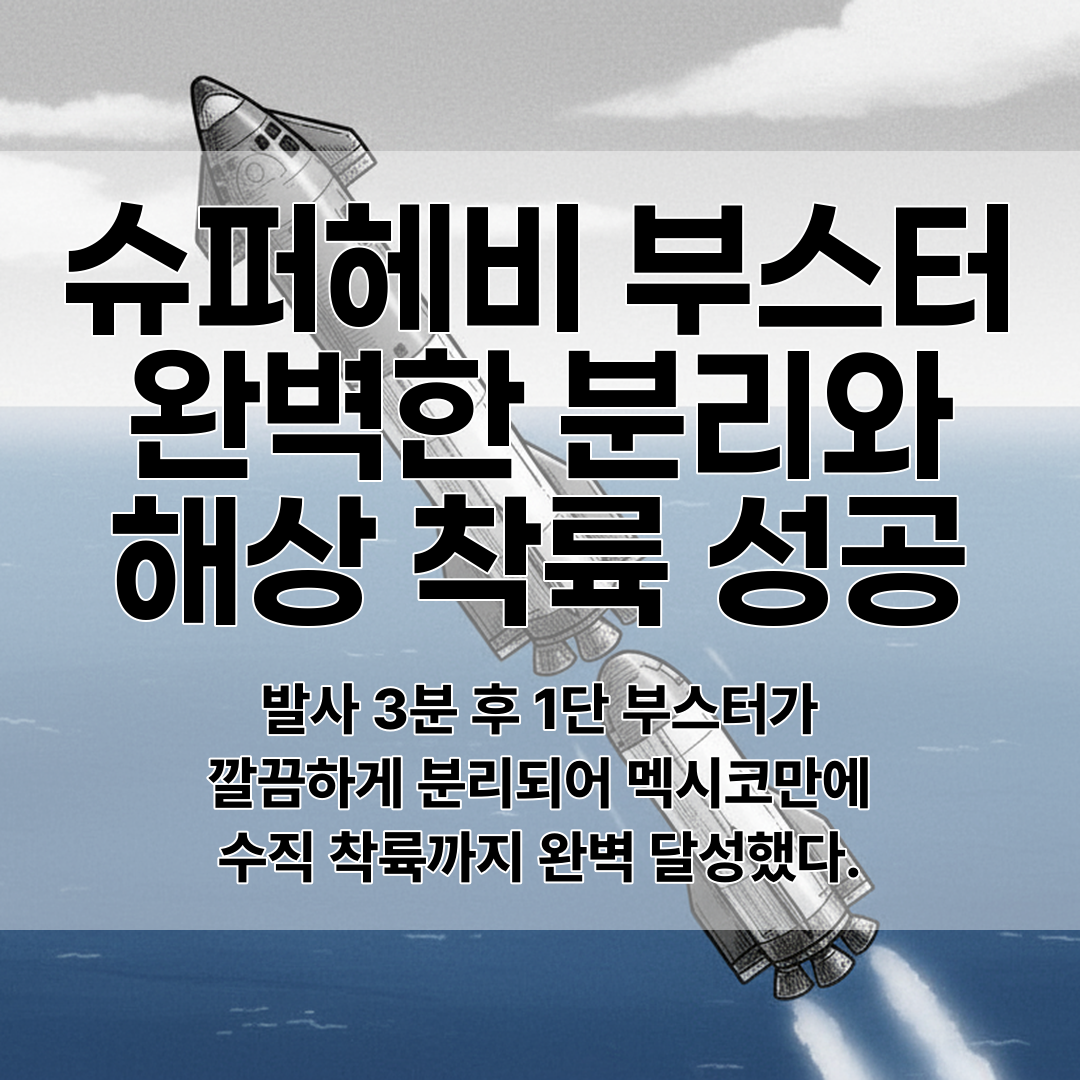 발사 3분 후 1단 슈퍼헤비 부스터가 2단 스타십과 분리된 후 멕시코만에 완벽하게 수직 착륙하여 재사용 로켓 기술을 성공적으로 입증했다.