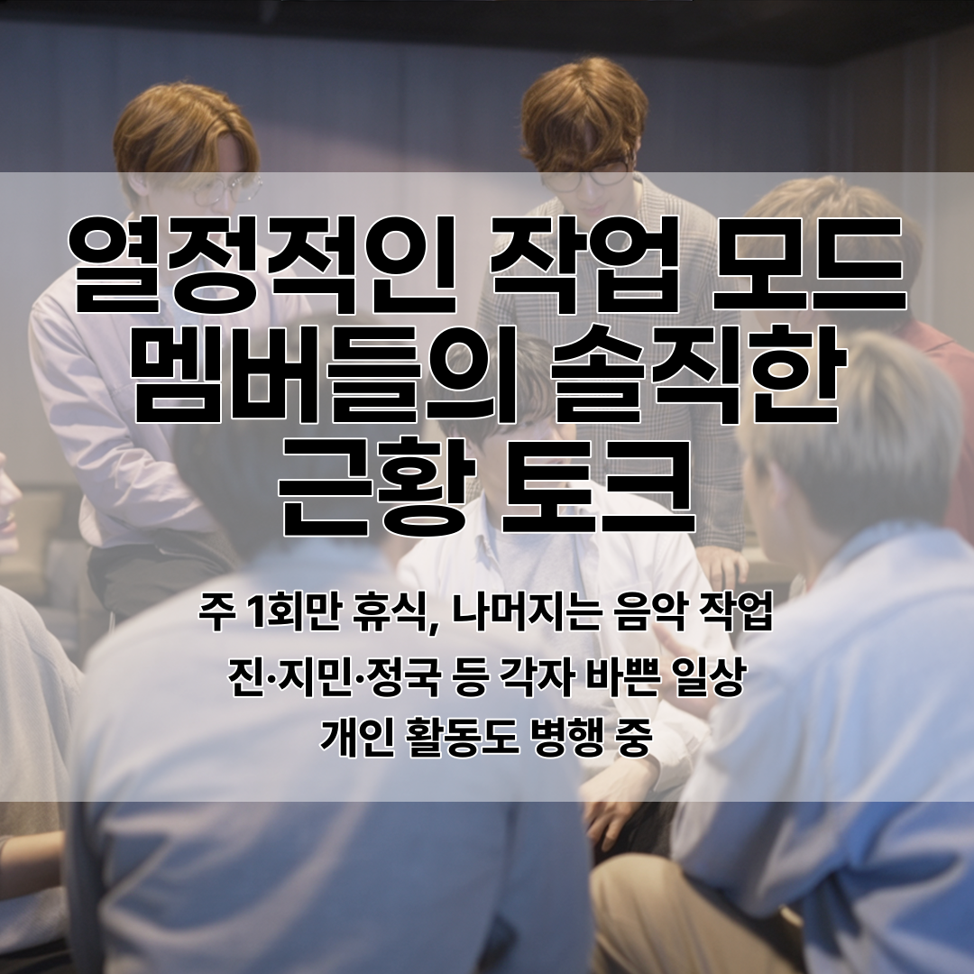 ⏺ 주 1회만 휴식, 나머지는 음악 작업 진·지민·정국 등 각자 바쁜 일상 개인 활동도 병행 중