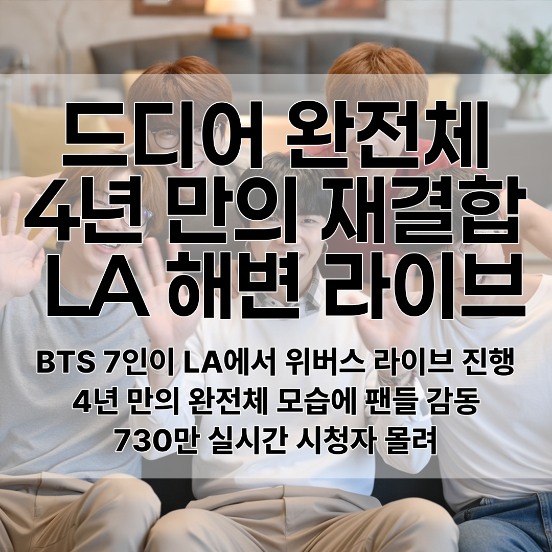 LA 해변이라는 이색적인 배경에서 진행된 라이브 방송에는 실시간으로 무려 730만 명이 접속했어요. 멤버들의 밝은 표정과 자연스러운 케미를 보니 정말 오랜만에 함께 모인 게 실감났습니다.