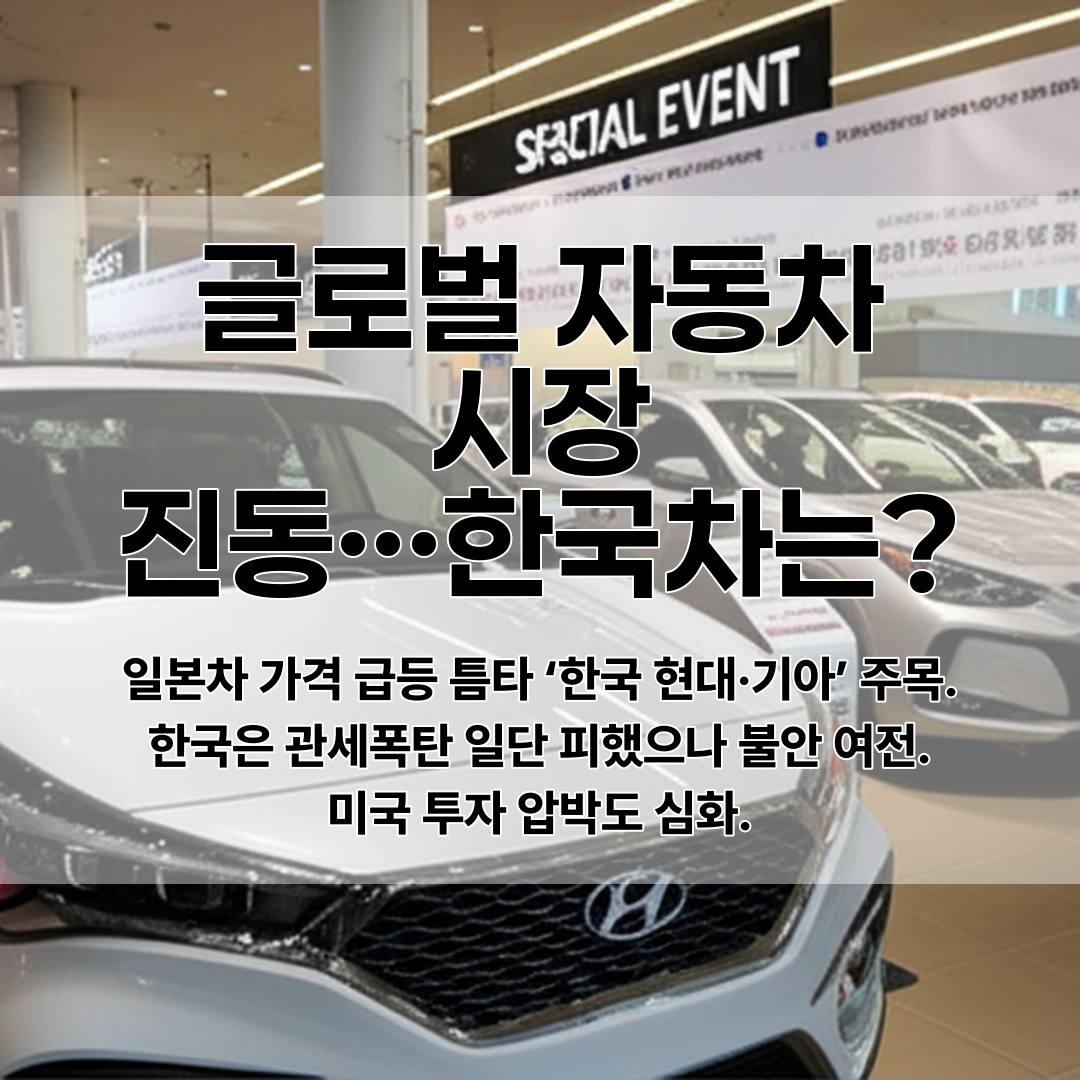 일본차 가격 급등에 한국 현대·기아 등 미국 판매 성장 기대감이 높아짐. 일부 전문가 “한국차도 안전지대 아니다”라며, 미국 현지 투자 확대 압박과 수출산업 리스크는 지속될 것으로 전망.