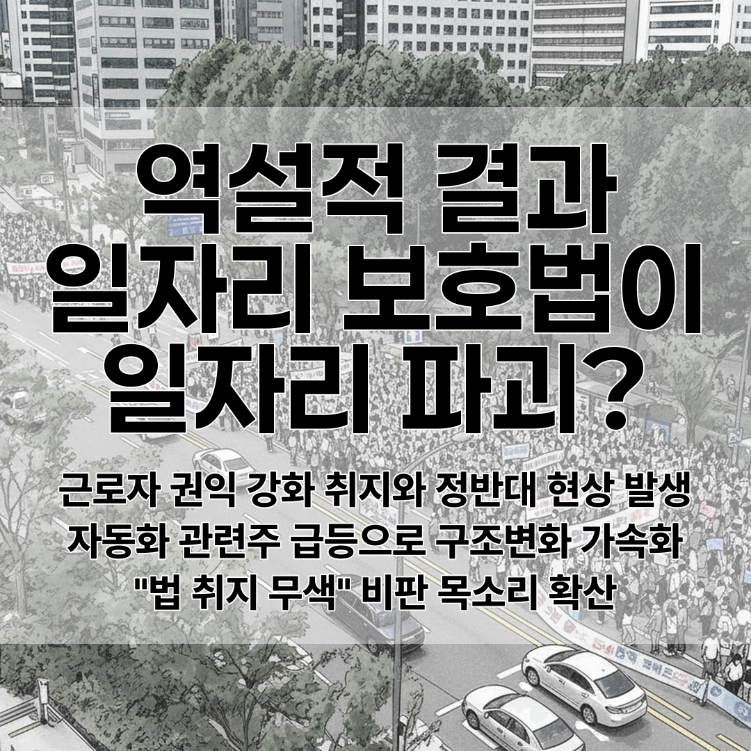 이는 단순한 비용 절감 차원을 넘어 산업 구조 자체의 변화를 의미합니다. 노동자 보호를 위해 만든 법이 오히려 대규모 일자리 소멸이라는 역설적 결과를 낳을 수 있다는 우려가 현실화되고 있는 상황입니다.