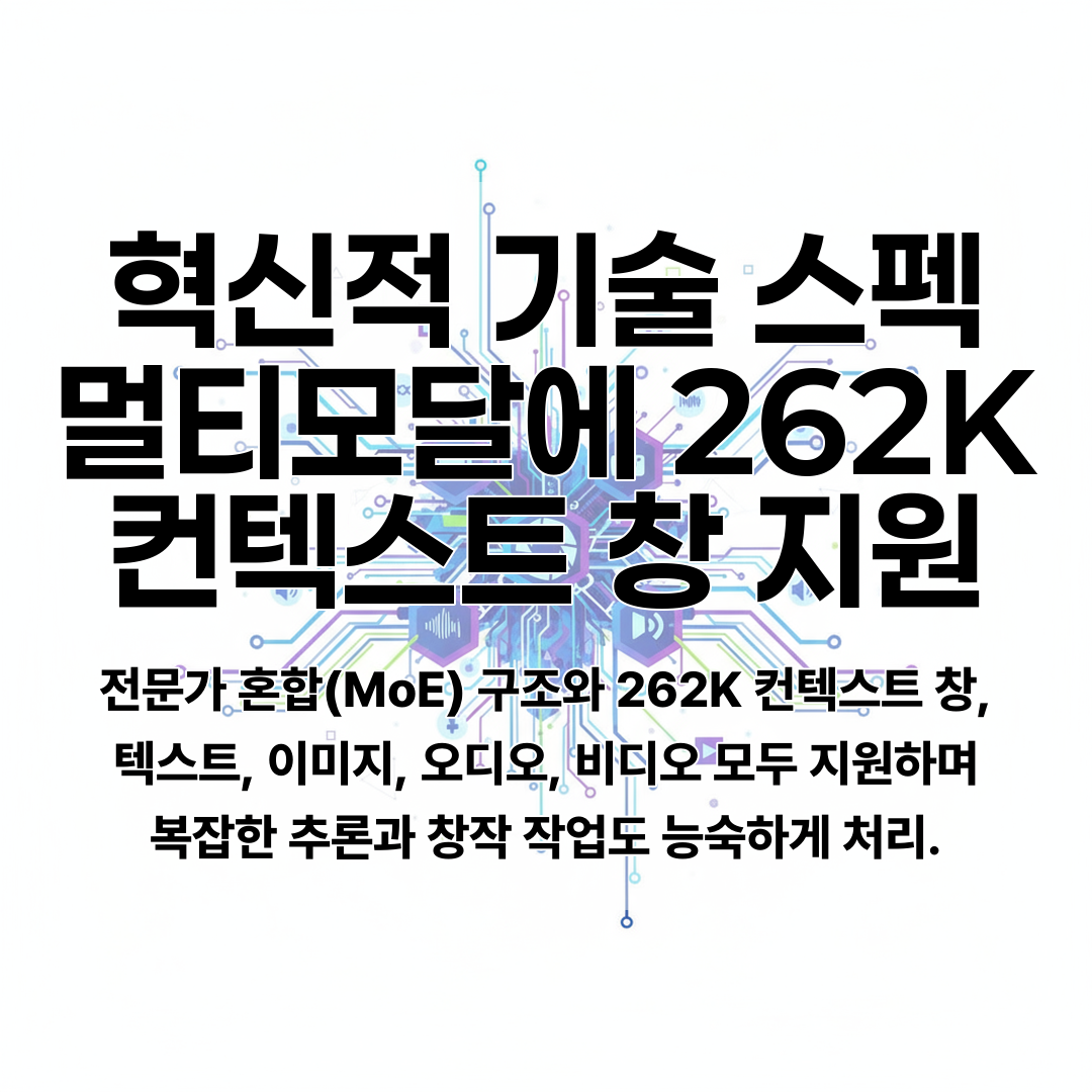 MoE(Mixture of Experts) 구조를 도입하여 262,000개 토큰의 초대형 컨텍스트 창을 지원하며, 텍스트, 이미지, 오디오, 비디오 등 멀티모달 데이터를 동시에 처리할 수 있어 대용량 문서나 복잡한 코드 작업에 최적화되었다.