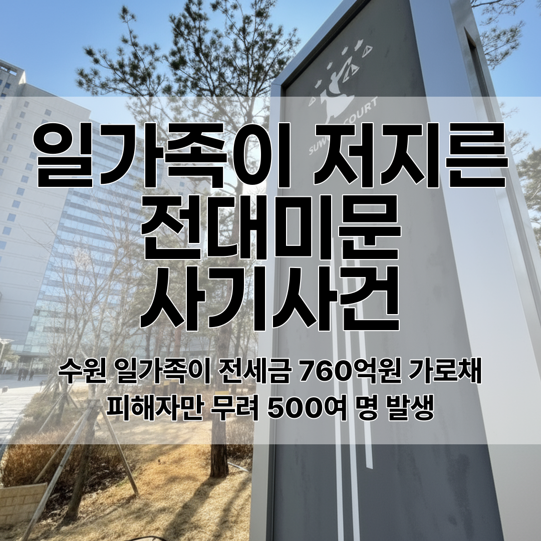 수원의 한 일가족이 800채의 주택을 이용해 임차인 500여 명을 대상으로 총 760억 원 규모의 전세 사기를 저질렀으며, 피해자 대부분은 서민과 젊은 신혼부부들이다.