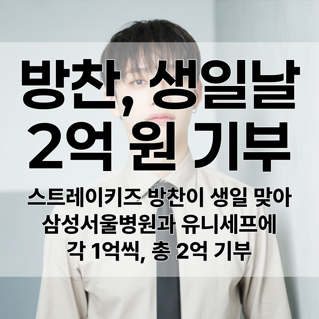 스트레이키즈 리더 방찬이 27번째 생일인 2025년 10월 3일, 삼성서울병원과 유니세프 한국위원회에 각각 1억 원씩 총 2억 원을 기부했다.