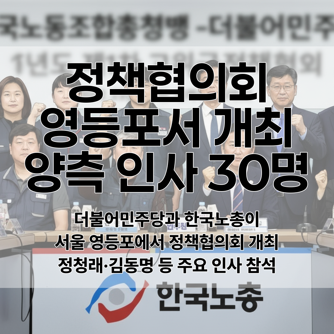 정청래 민주당 대표와 김동명 한국노총 위원장을 비롯해 양측 주요 인사 30여 명이 참석했어요. 정기국회를 앞두고 정치권과 노동계가 공식 소통 창구를 마련한 의미 있는 자리였죠.